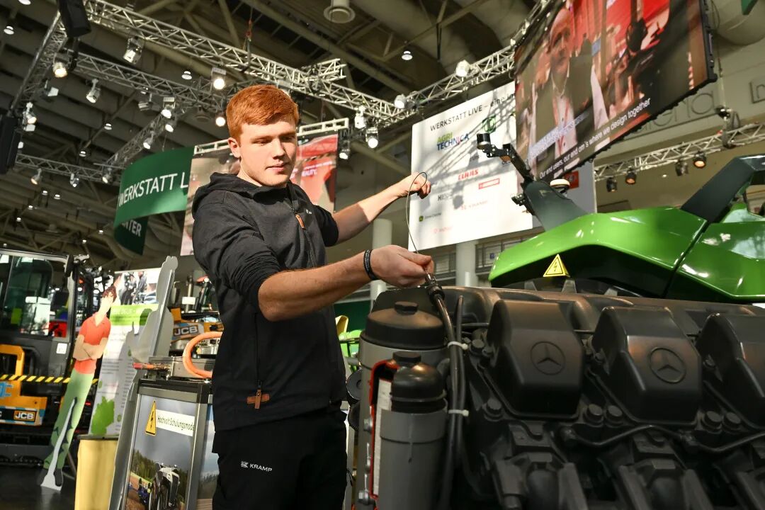 在 DLG 焦点活动的“车间现场”中,机械师团队深入展示了农用及工程机械机电一体化技术人员的工作实况。每小时的现场演示环节则呈现了拖拉机等农用设备典型的维护流程。观众可与车间团队及专家互动交流,深入了解行业动态并咨询专业问题。