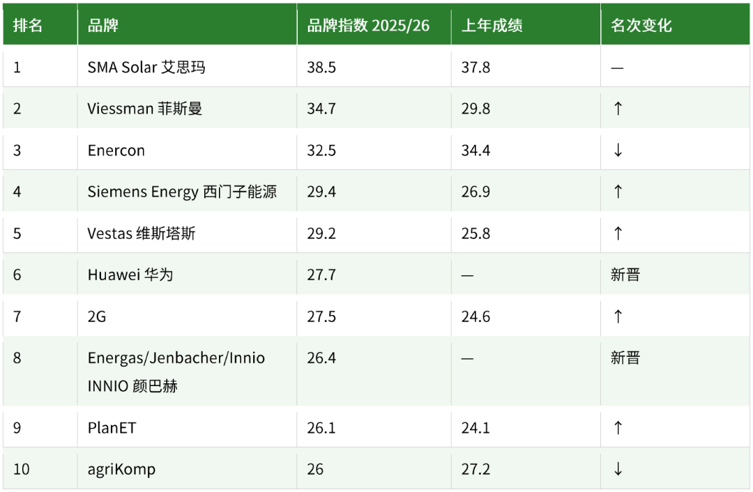 可再生能源领域榜首位置不变,但整体格局焕然一新。2025/26年度榜单中,华为(Huawei)的出现尤为引人注目,成为本年度最具标志性的亮点之一。