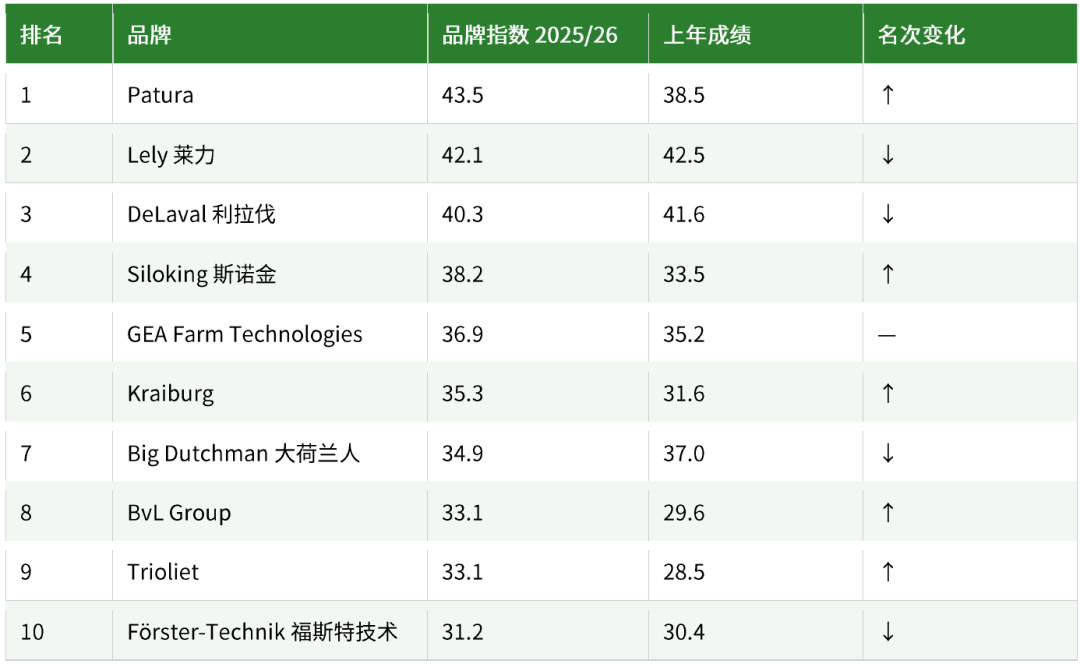与此同时,斯诺金(Siloking)、BvL 和 Trioliet 三家饲料搅拌车制造商集体跻身前十。在生猪和家禽养殖户群体中,大荷兰人(Big Dutchman)稳居首位。莱力(Lely)则在北部地区及品牌形象维度持续保持领先。