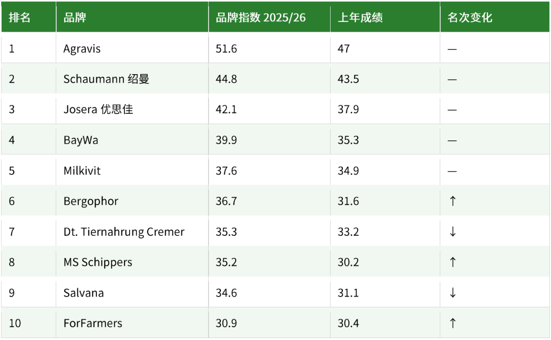 从区域来看,BayWa 在德国南部超越 Agravis 位居第一,Milkivit 也以第三名跻身前三。优思佳(Josera)在南部和西部保持第二,而在东部地区,BAT Agrar 凭借该领域最大的分值增长升至第三。