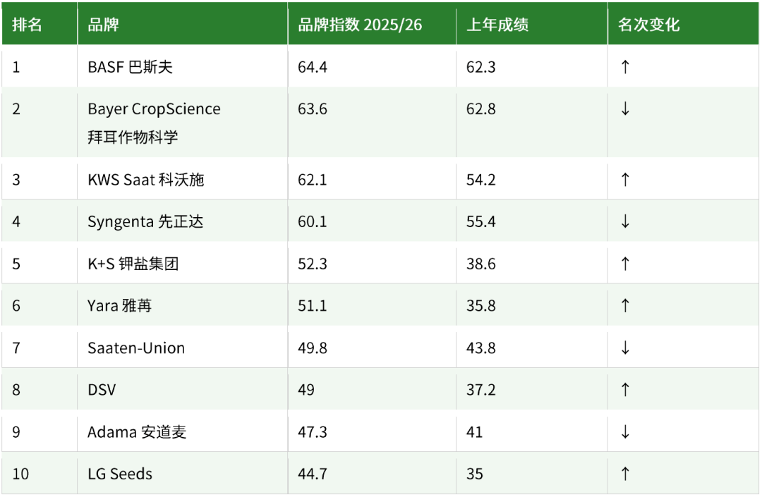 中段排名变动较为明显:德国钾盐集团(K+S)再次上升两位;雅苒(Yara)更跃升四位——这家化肥专家去年才刚刚首度跻身前十;DSV 和 LG Seeds 亦呈上升态势。